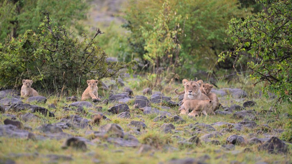 Bereits am ersten ganzen Tag unserer Kenya-Safari sehen wir die vier Löwen-Babys der Moniko Lion Pride zum ersten Mal. Die Löwen-Mütter sind sehr aufmerksam, während die Löwen-Babys drollig durch die Büsche wackeln und miteinander spielen.